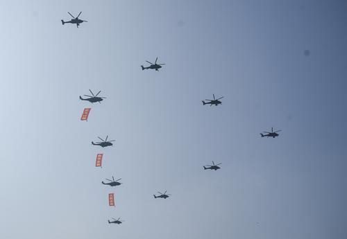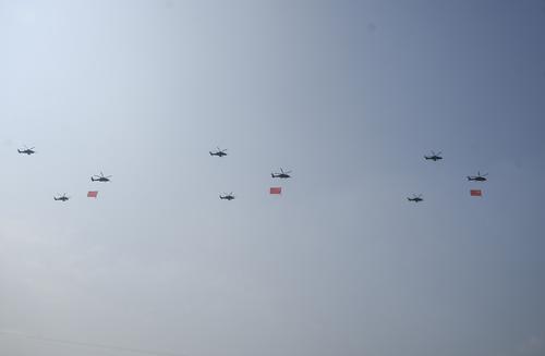 空中護旗梯隊通過天安門廣場,中國共產黨黨旗、中華人民共和國國旗、中國人民解放軍軍旗各懸掛在直20通用直升機下方,分別由2架“江西造”直-10武裝直升機組成僚機進行護衛。