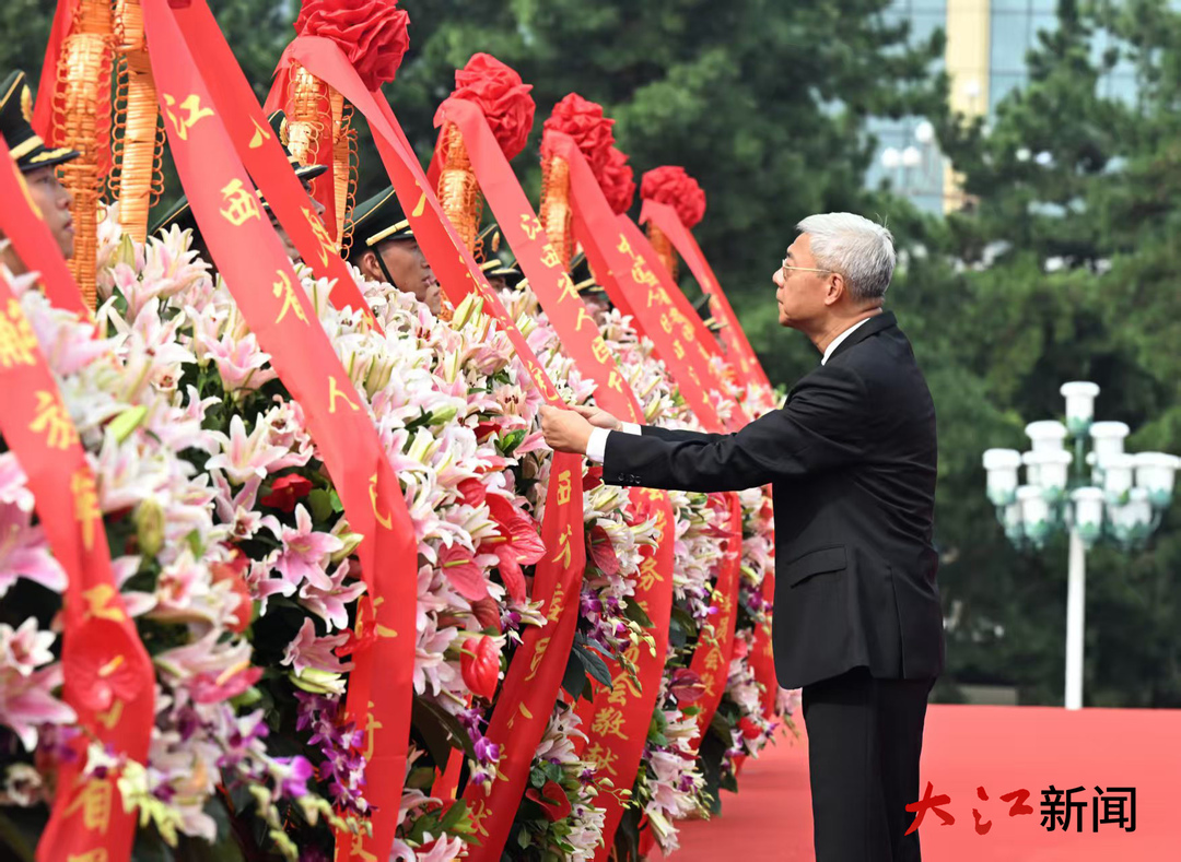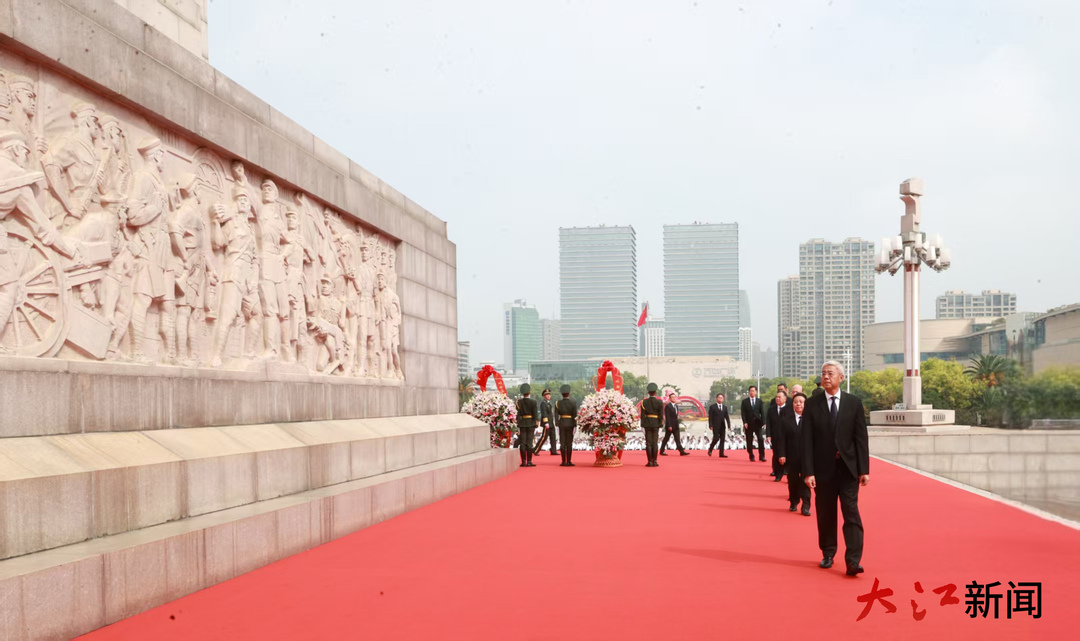 尹弘等省領導緩緩拾級而上,來到花籃前列隊、肅立。尹弘邁步上前,在省委敬獻的花籃前駐足凝視,仔細整理花籃緞帶。隨后,省領導和各界人士代表依次緩步繞行,瞻仰紀念塔、敬獻鮮花。