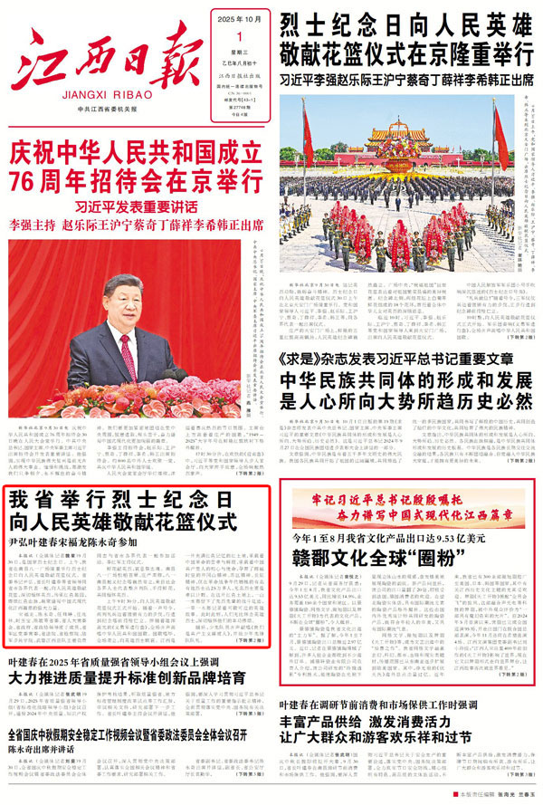 大江新聞訊江西日報全媒體記者魏星報道:9月30日,是國家烈士紀念日。上午,我省在南昌八一廣場隆重舉行烈士紀念日向人民英雄敬獻花籃儀式。省委書記尹弘、省長葉建春等省領導同省市各界代表一起,向人民英雄敬獻花籃,深切緬懷英烈,傳承紅色基因,賡續紅色血脈,凝聚譜寫中國式現代化江西篇章的強大力量。
