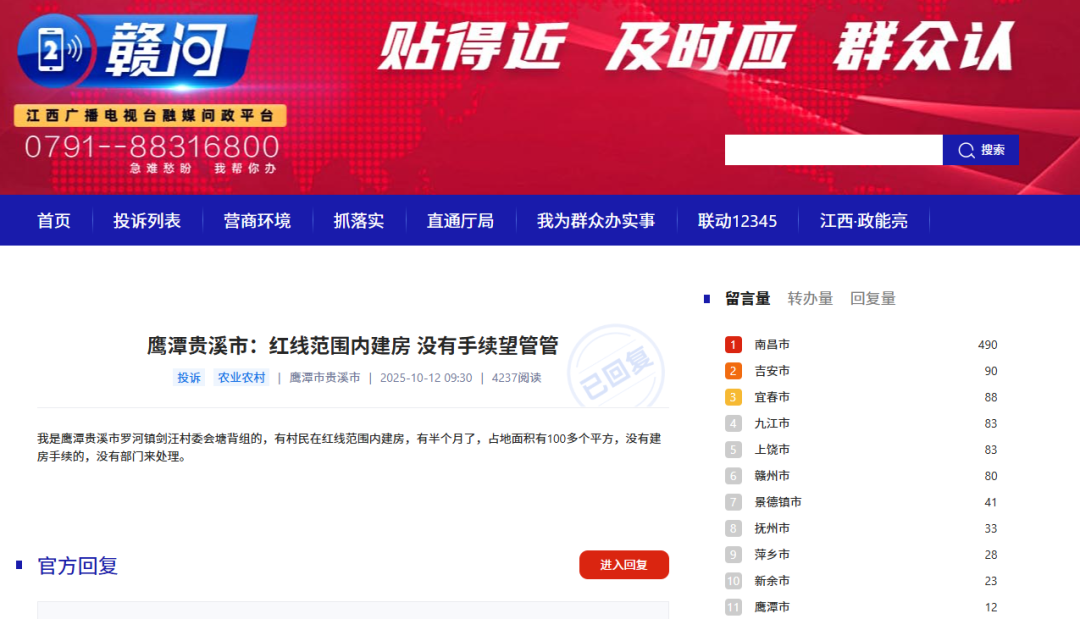 《贛問》平臺轉來的《鷹潭貴溪市:紅線范圍內建房沒有手續望管管》已收悉。