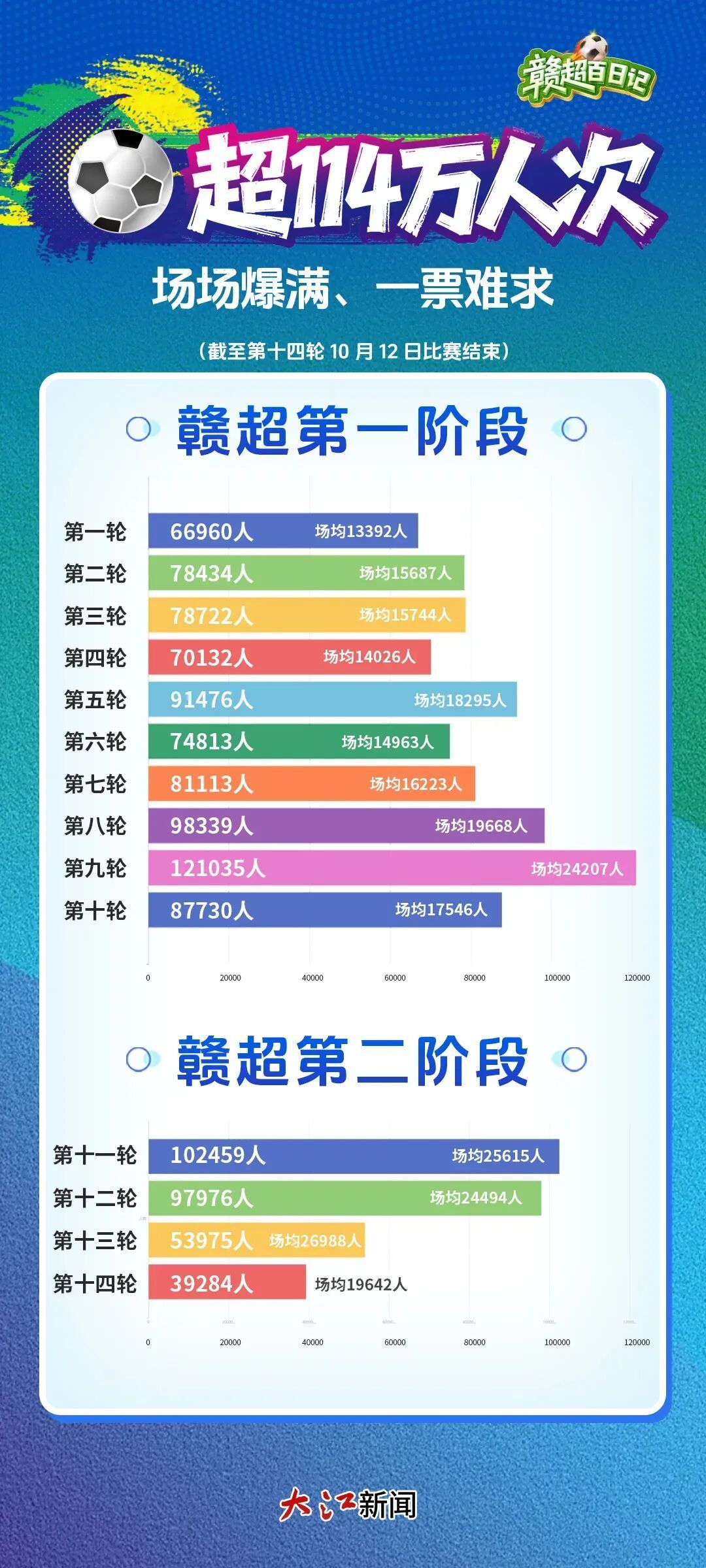 贛超徹底打破了過去江西業余足球賽事“門可羅雀”的局面,實現從局部關注到全民關注的蛻變。首輪賽事就吸引66960人現場觀賽,場均13392人;至第九輪,單輪觀賽人數突破12萬,創下贛超聯賽單輪到場人數新紀錄;八強賽淘汰賽首回合,南昌主場迎戰贛州單場觀賽人數更是達到50168人,為江西體育賽事單場觀賽人數之最;截至第十四輪賽事,累計已有超114萬人次到場觀賽,場均18427人。