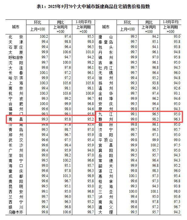 9月份南昌、九江、贛州新建商品住宅價格同比、環比均下降